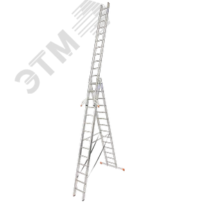 Трехсекционная универсальная лестница используется как приставная или выдвижная лестница, а так же как стремянка с выдвижной частью. Стальные направляющие с порошковым покрытием облегчают пользование лестницей. Самофиксирующаяся скоба для безопасной транспортировки (AutoSnap-System). Крепкие ремни, устойчивые к погодным воздействиям, предохраняют части лестниц от расхождения в положении стремянки. Широкая поперечная траверса для большей безопасности. Нескользящие заглушки и насадки боковин (SafetyCap). Лестница имеет дополнительную функцию - установка на ступенях. Съёмная часть лестницы не оборудована Trigon-Траверсой, поэтому соответствует EN 131 редакции 2012 года (предпоследняя версия). Продукт сертифицирован в строгом соответствии с ГОСТ 24258-88 и DIN EN-131 (редакции 2012 г.).